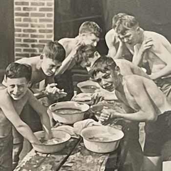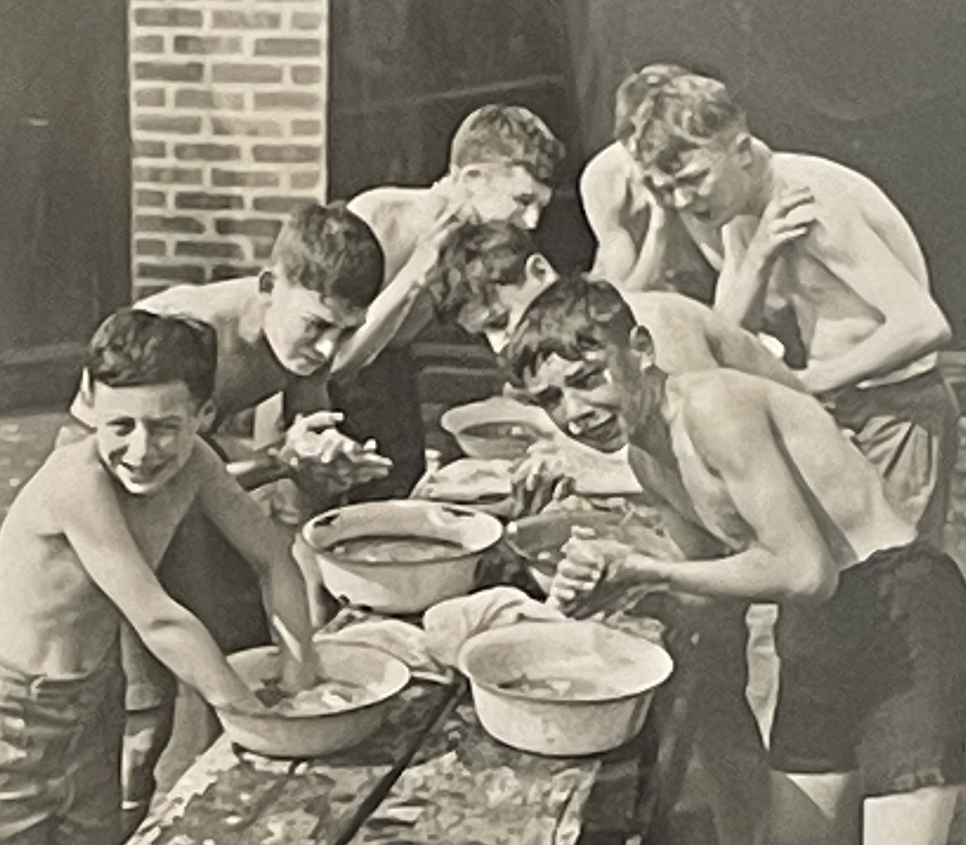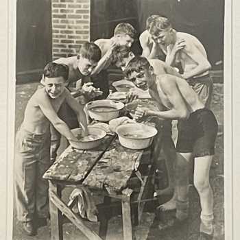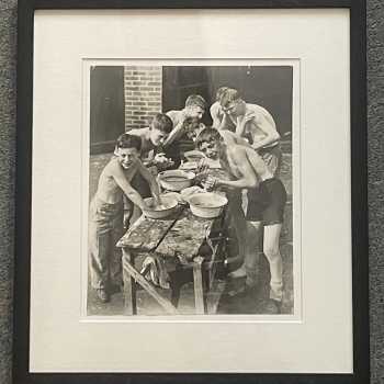 Forest Green Boys Agence Trampus Original Press Photo Frame: 14” x 12” Image: 10” x 8” Agence Trampus was a French press photo agency active in the 1930s and 40s. In 1935 it sent a photojournalist to record aspects of the English Education System. Here he caught boys of Forest Green School washing at their annual camp.