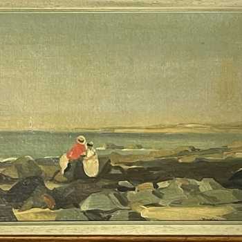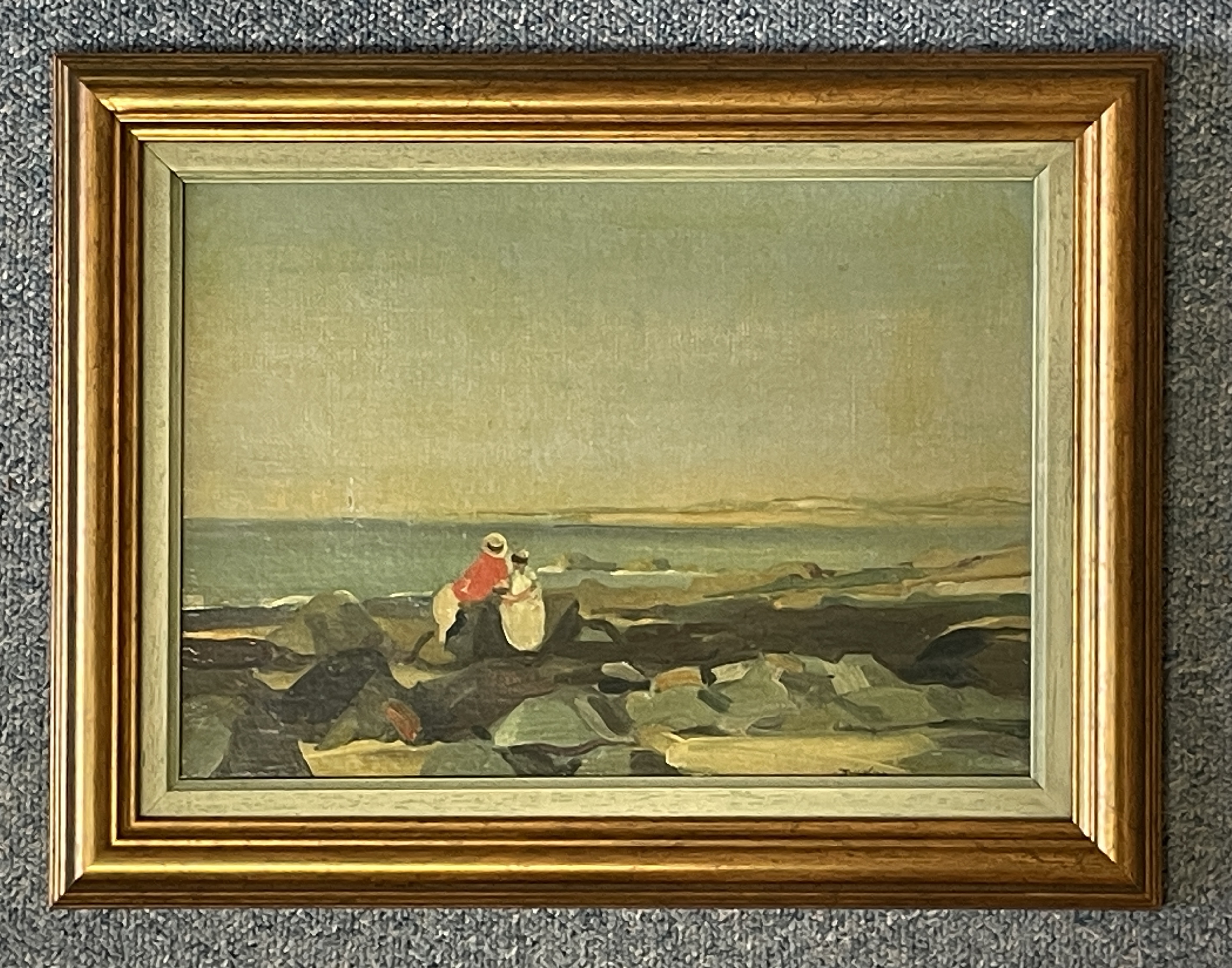 John Nicolson RBA RSW (1891-1951) Beach Scene with Lovers Oil on Canvas laid to Board Signed Frame: 12” x 14” Image: 9” x 12” John Nicolson (1891-1951) was the son of the artist Alec Nicolson and was born in London. He studied at St.Martins School of Art and exhibited widely, RSW 33 times, RBA 29, RA 12, ROI 2, RHA13 ,RSA 20 etc. He was elected to the, RBA 1929, ARE 1923 and the RSW 1930 and was awarded a silver medal at the Paris Salon in 1946. Lived in Streatham, London.